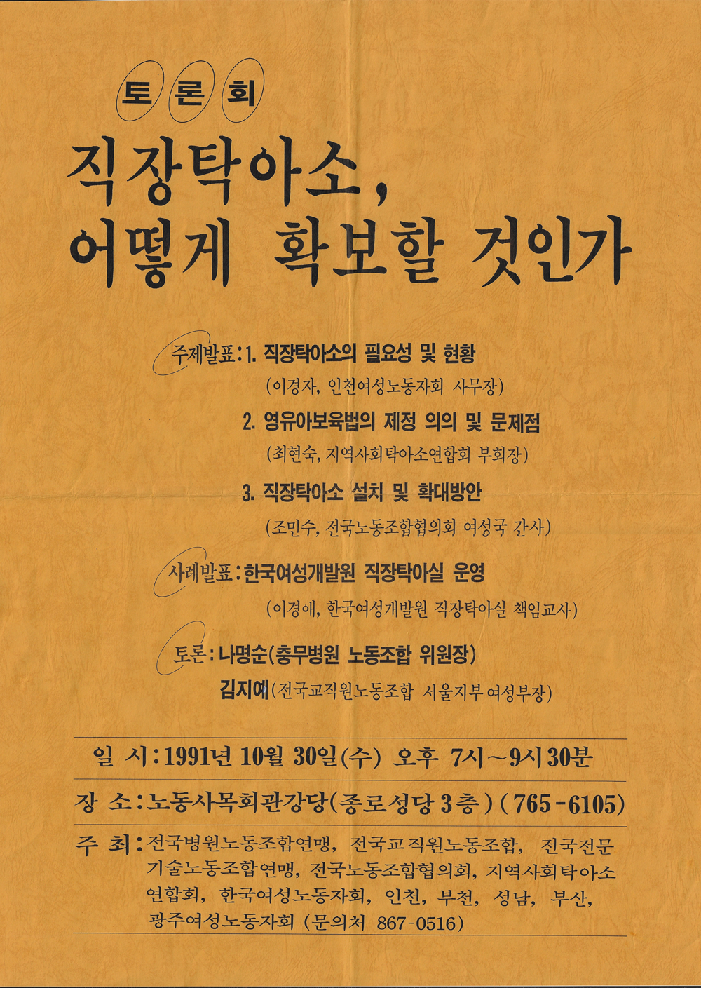 [포스터]1991년 '직장탁아소 어떻게 확보할 것인가 정책토론회'