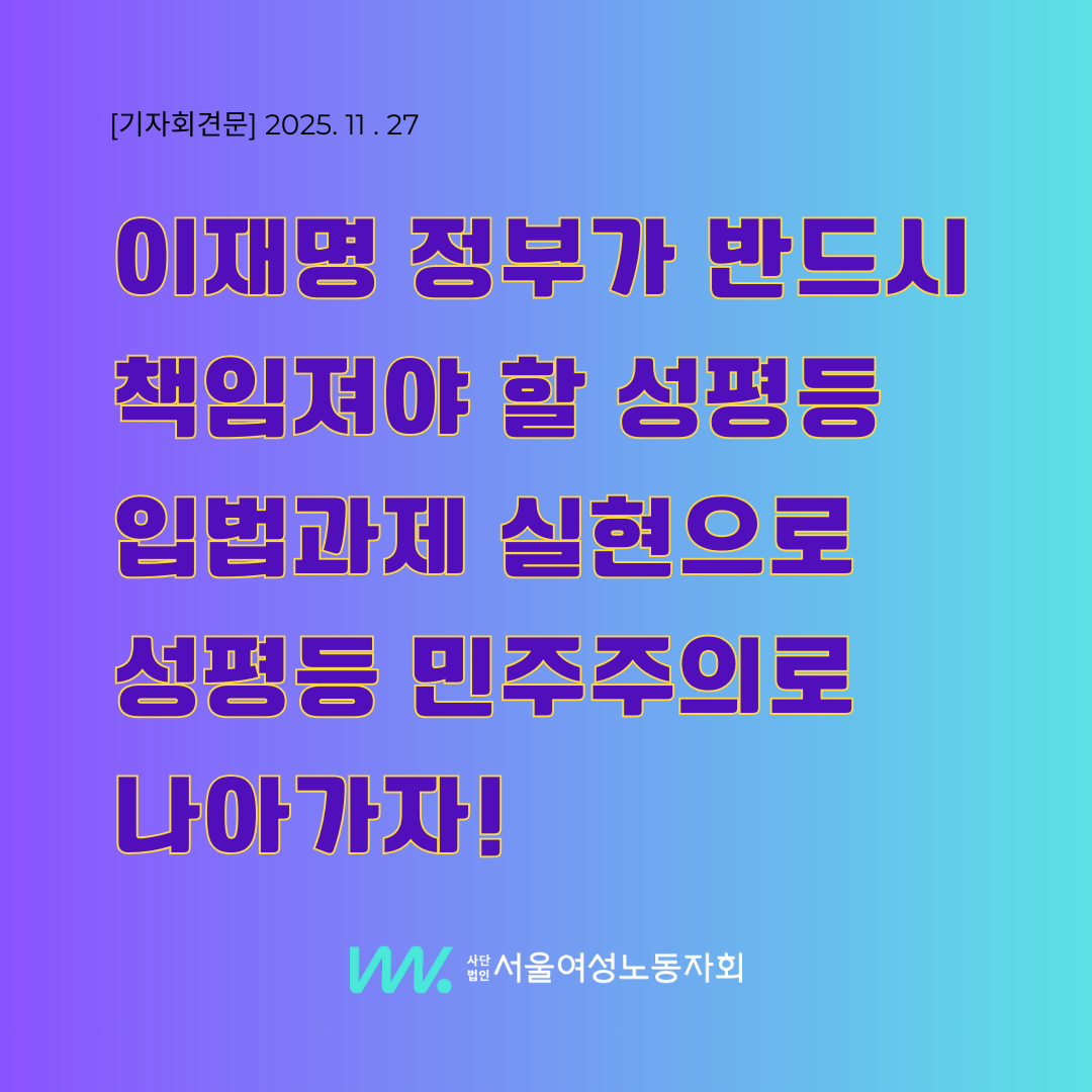 이재명 정부는 국민이 헌정 질서를 지키기 위해 온몸으로 싸워 되찾은 민주주의 위에서 출범하였습니다. 그렇기에 어느 정권보다 더 깊이, 더 멀리 개혁의 길을 내딛어야 하며, 그 누구도 제대로 해내지 못한 ‘성평등’을 개혁의 중심에 두어야 하는 시대적 과제를 안고 있습니다. 여성과 소수자가 일터와 삶에서 겪는 차별과 폭력은 결코 타협하거나 미룰 수 있는 과제가 아닙니다. 지금 이 순간에도 누군가는 일터를 떠나고, 피해 사실을 감추고, 상처를 안고 살아가는 현실을 외면하지 말아주십시오.