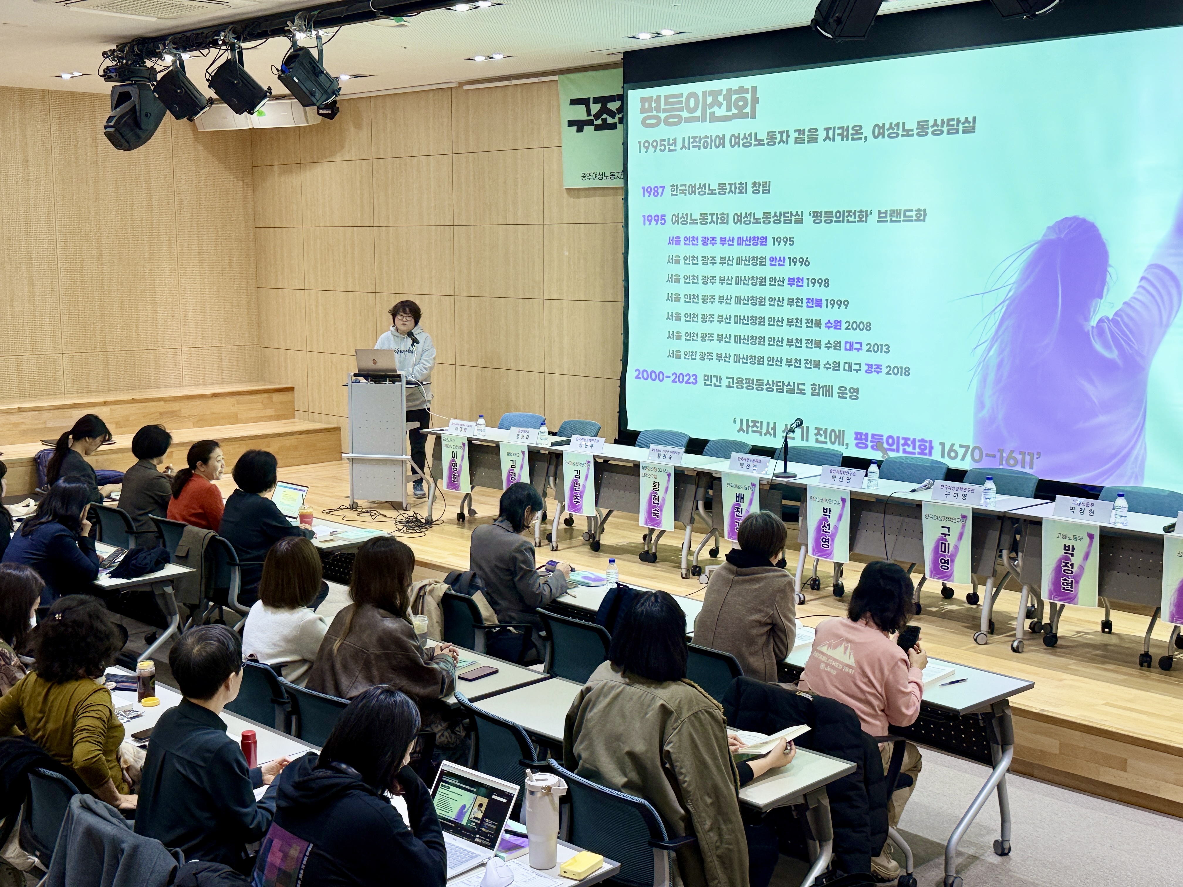 다음으로 ‘평등의전화 30주년 사례연구팀’을 대표하여 황현숙 서울여성노동자회 이사가 발제에 나섰습니다. 황현숙 이사는 '한국사회 노동시장 변화, 여성노동 관련 법 제도 변화 등을 반영해 10년 단위로 시기를 구분해 상담사례를 분석'한 결과를 발표하였습니다.