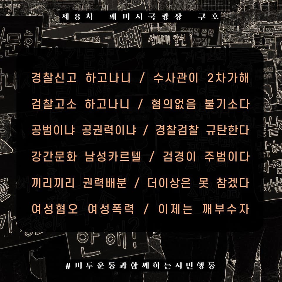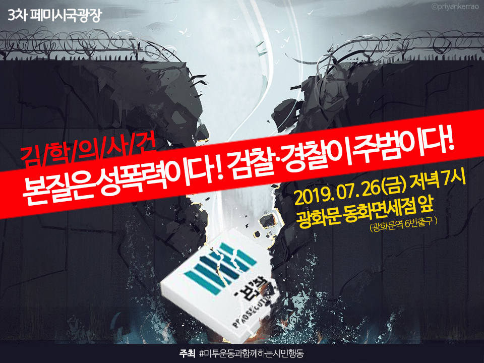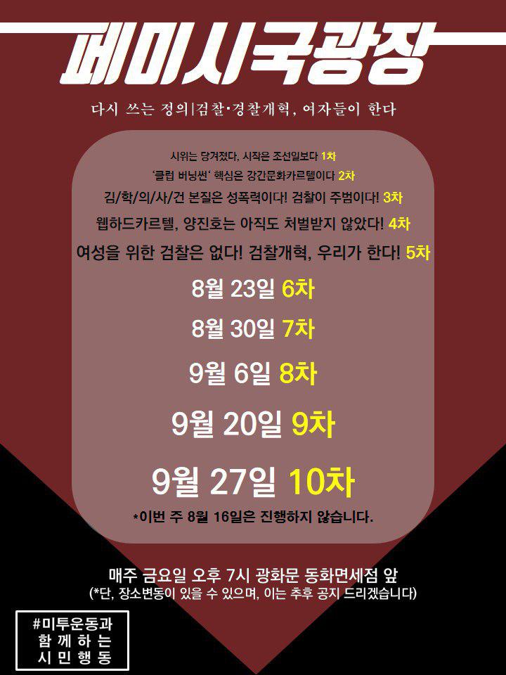 #미투운동과함께하는시민행동은 매주 금요일(7/12일부터) 이 사건들에 대한 실체적 진실규명을 요구하는 페미시국광장을 열어갑니다. 정의는 다시 쓰여질 것입니다.